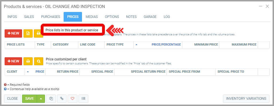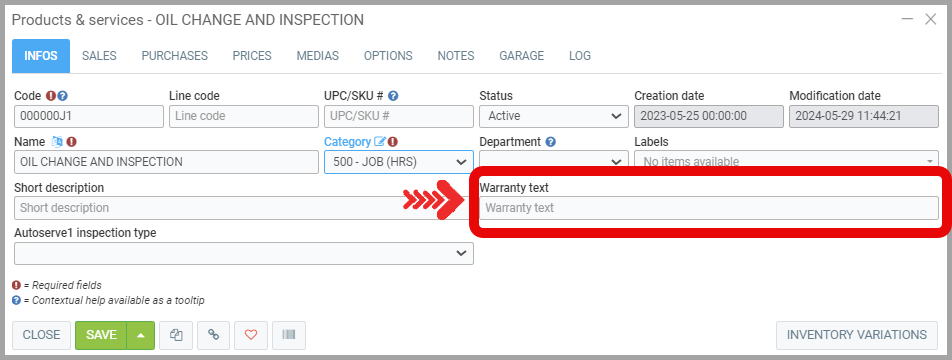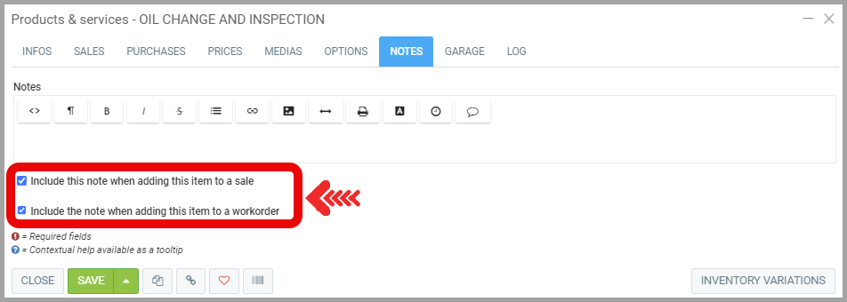 Important! The notes entered here do not appear on the customer's estimate or invoice. They are seen when adding the item to the sale or on the work order, depending on the option you have selected. For legal notes that you want to see on the customer's estimate or invoice, enter them under the INFOS tab.