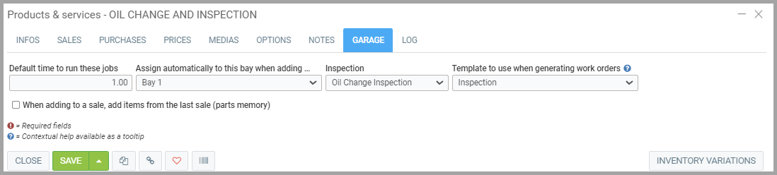 Finally, select When adding to the sale, add the items from the last sale for services that the customer will frequently use the same items for. This can be useful for oil changes, for example, since the customer who keeps their vehicle will probably continue to buy the same oil and filter. See Parts Memory to Automate the Addition of Parts on the Estimate to better understand how this option works.