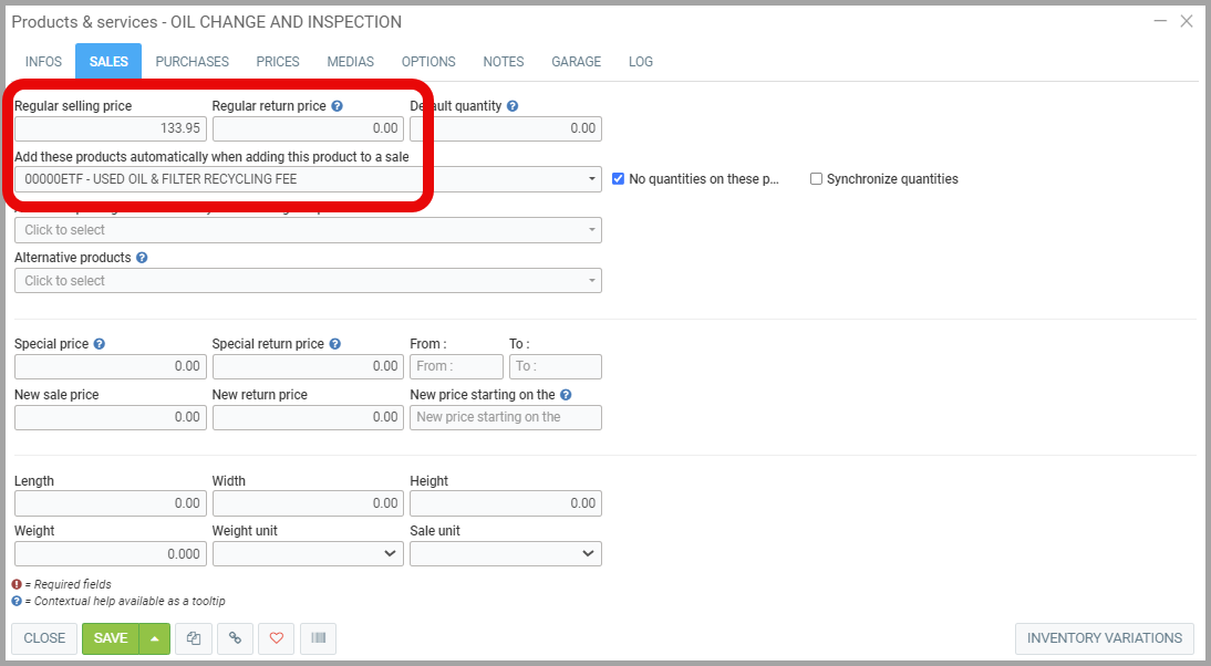 Adding products automatically when adding the product to a sale can help prevent you from forgetting certain charges. The recycling fee for an oil change or a battery replacement is an example of this.