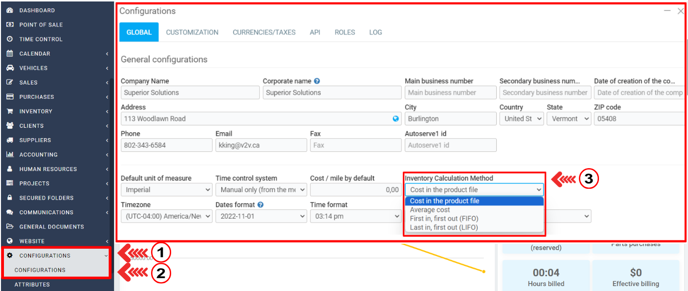 Click on the menu on the left, Configurations > Configurations > Global tab, click on the inventory calculation method and select one of the options.