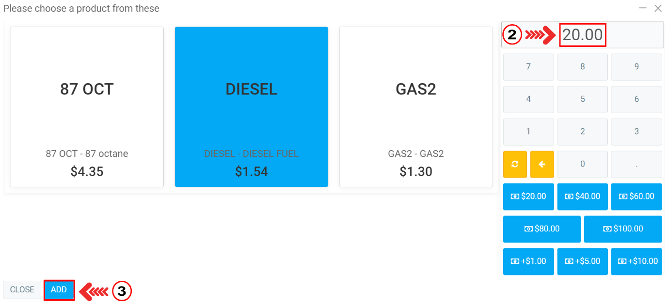 In the Point of Sale, select the customer you want and click on Fuel in the left corner of the window, next to the Tires icon.