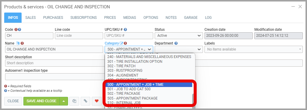Note: The Garage tab only appears when the category is in the 500s, indicating it is a Job that involves an appointment.