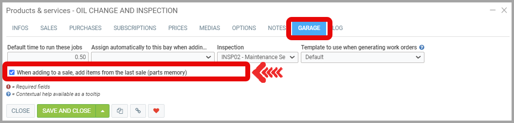 - Check the box for When adding to a sale, add items from the last sale (parts memory) and click Save.