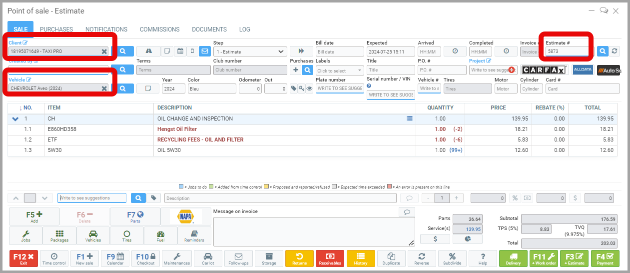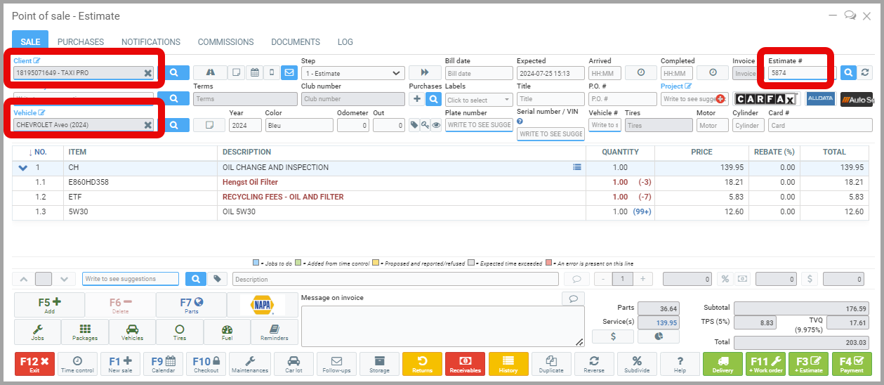 Once the sale is completed and paid for, the added products are remembered in the vehicle's file. - Open a new sale for the same customer and the same car.