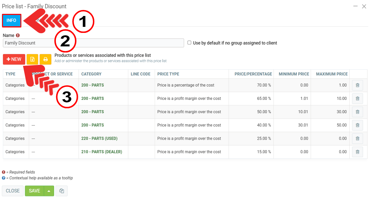 After assigning a name to the list, in the Info tab, click +New next to Products or services associated with this price list, to create the basic matrix.