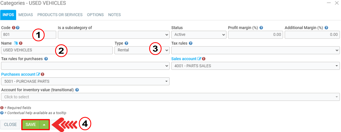 To create a used vehicle category, click on Inventory > Categories > +New.