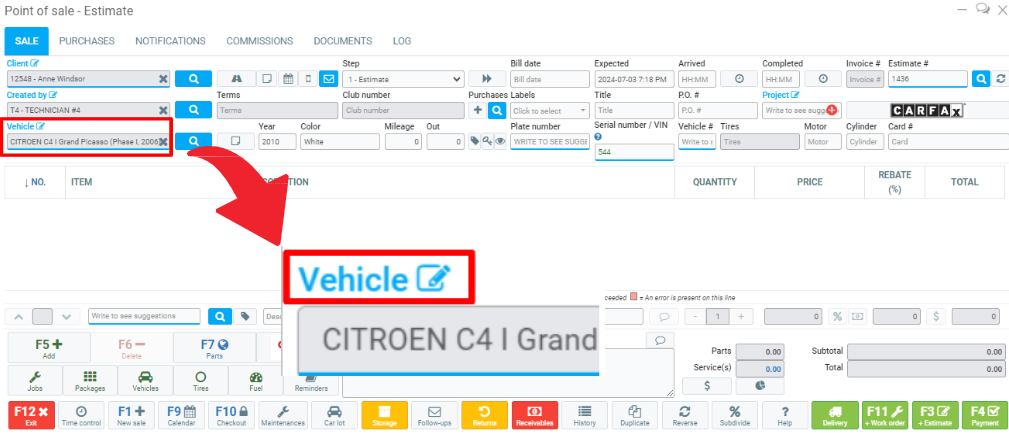 In the Point of sale, click on the "Vehicle" link at the top of the field.