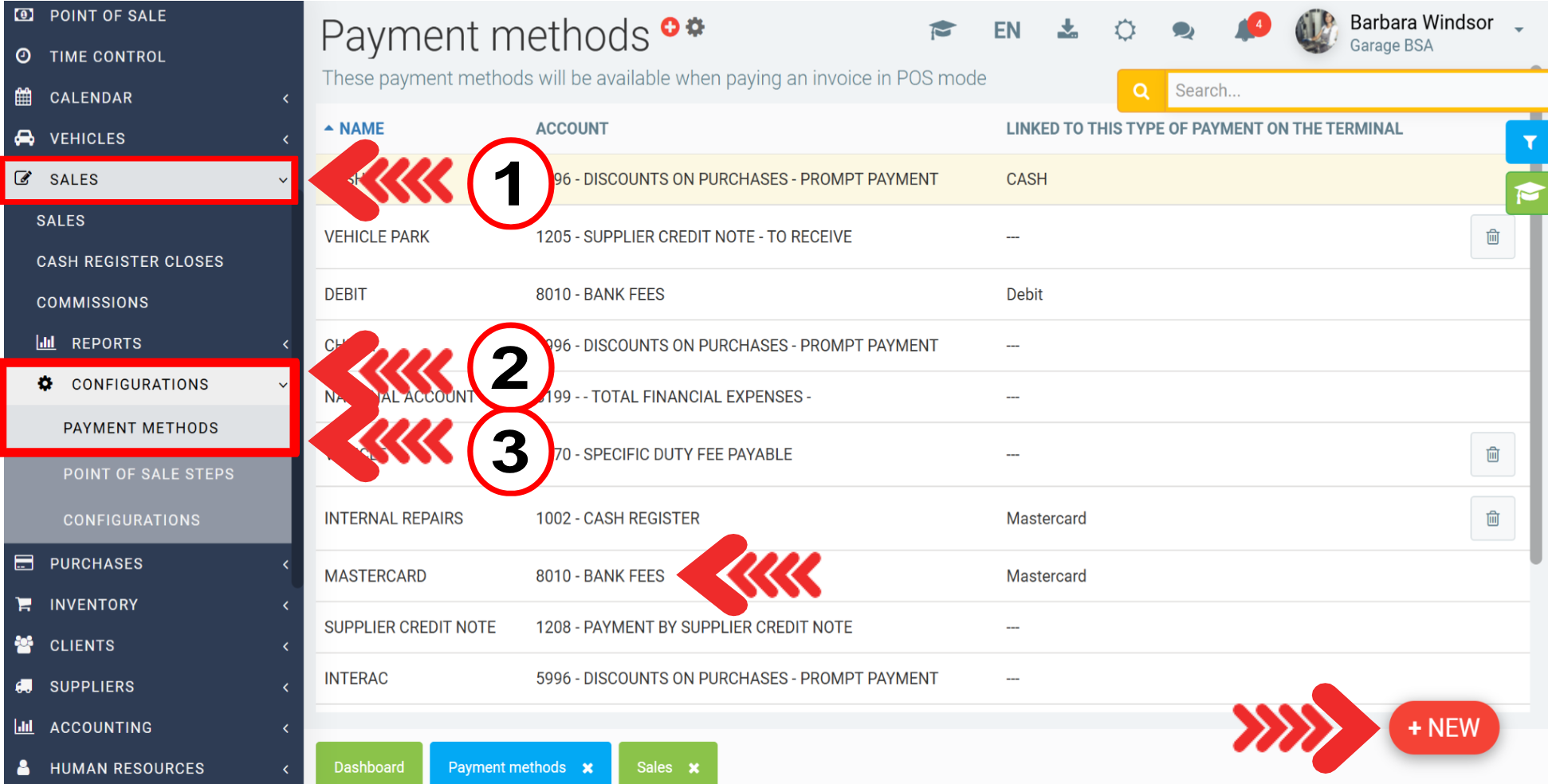 To modify your payment methods, from the main menu on the left of the application, click on Sales > Configurations > Payment methods.