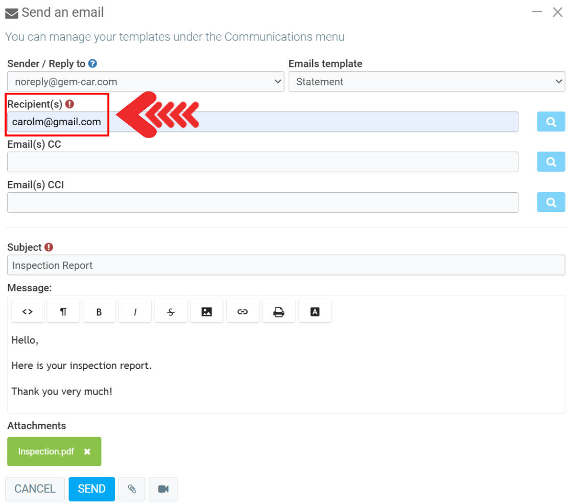 Enter the email address where you want the invoice to be sent, in the Recipient(s) section, and click on Send. If the window does not open automatically, you can find the invoice under the Documents tab of the sale and click on the envelope icon located on the same line as the document.