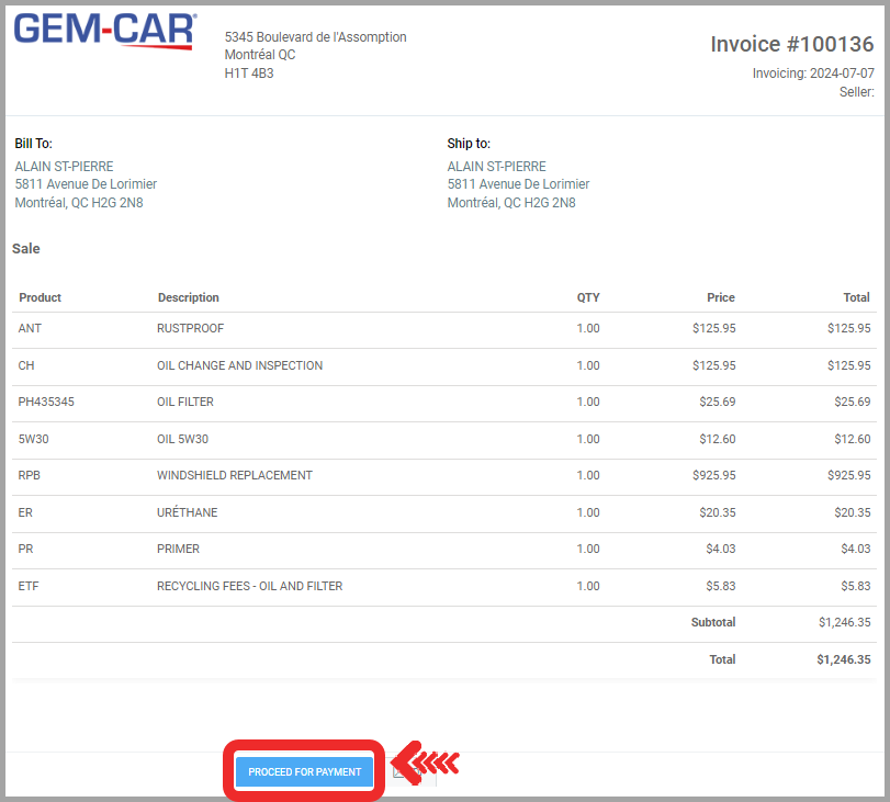 From the email, the client clicks on Pay Online > Proceed to Payment and manually enters their credit card information.