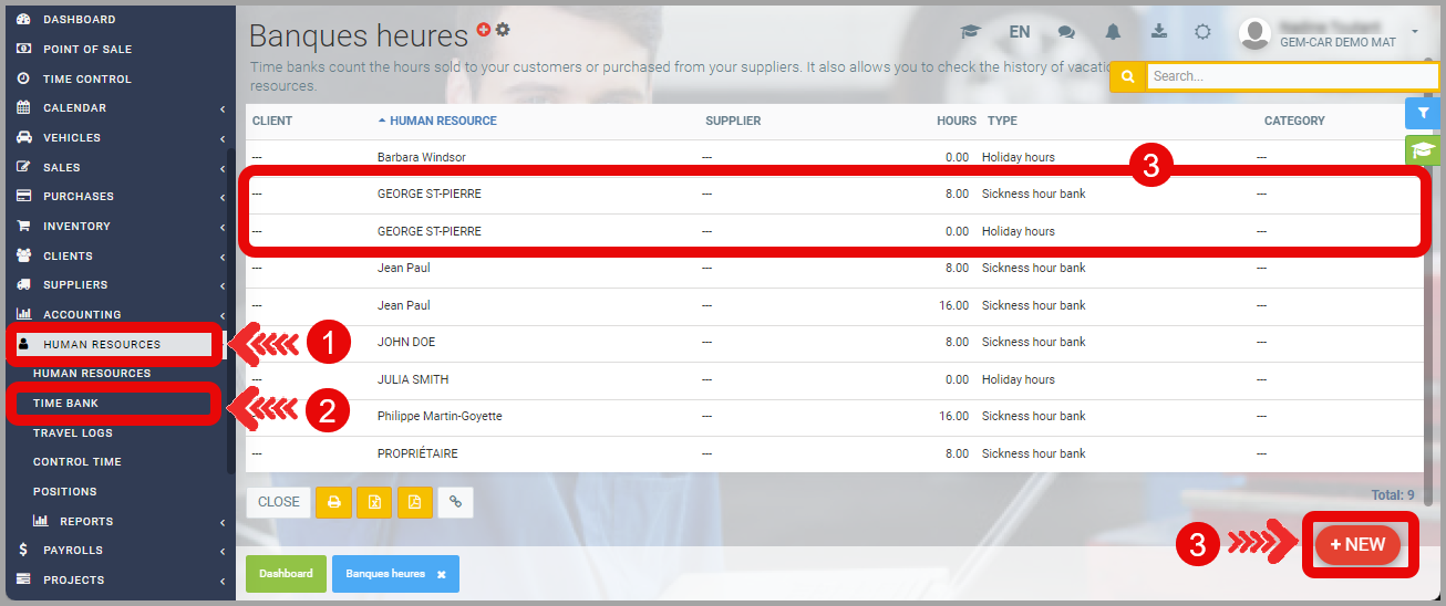 Select the employee and the type of hour bank you want to modify, or click on +New to create a new one.