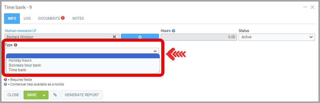 Once your Type Bank is created for a Human resource, select the Type of Hours.