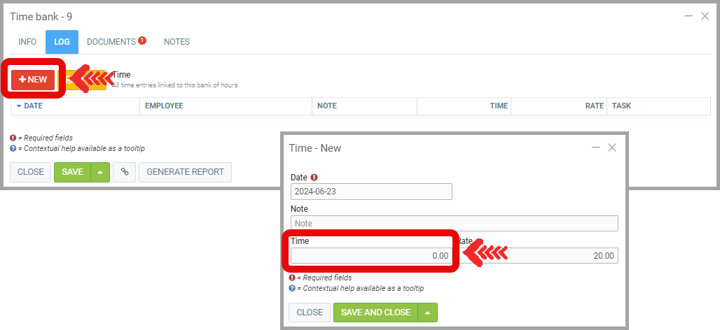 To add or remove time, go to the Log tab and click on +New.