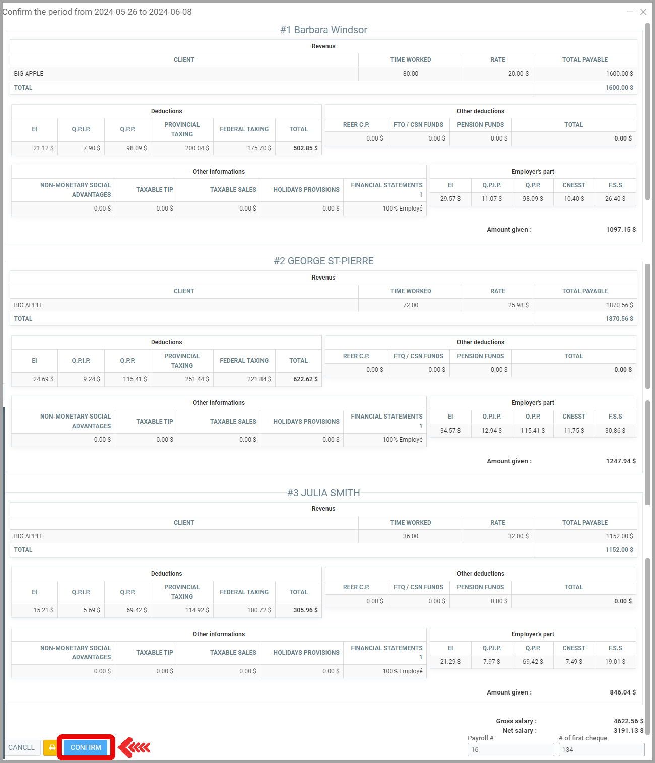 - The report will present, for each employee, a summary of hours worked, salary, deductions, and other relevant information.