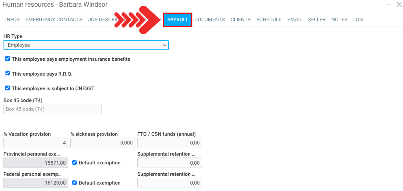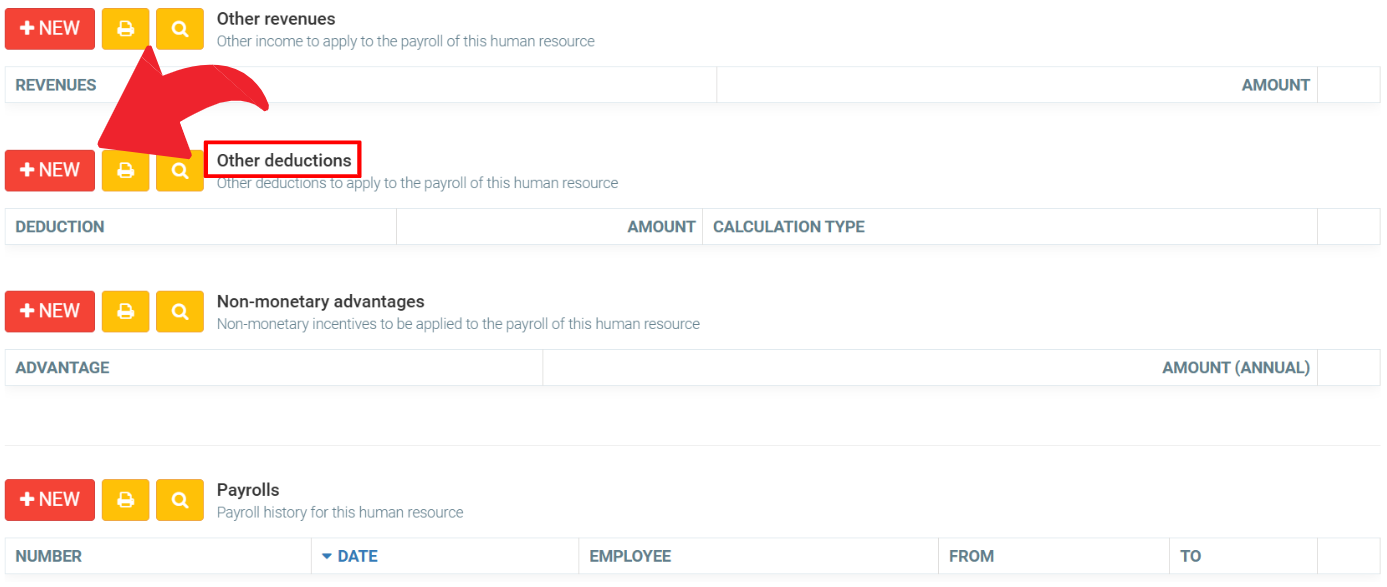 As with other types of income, it is possible to set up additional deductions, such as alimony* or RRSPs. For a deduction, it is possible to configure whether it is calculated annually, by the hour, or on a percentage of gross salary. When configuring the payroll of a human resource in the next step, you can enter the amount in money or as a percentage, depending on the configuration specified here. There is also a checkbox to indicate when the employer is the one paying the amount instead of the human resource.