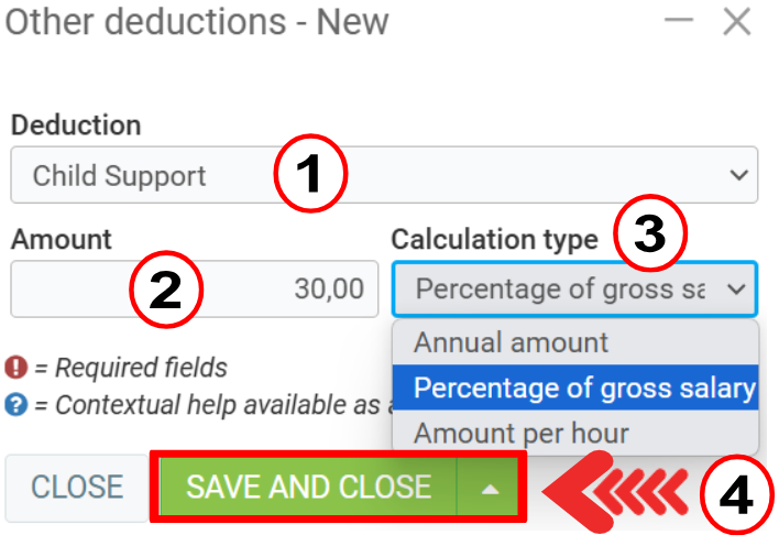 - Calculation type (Annual amount, Percentage of gross salary or Amount per hour)