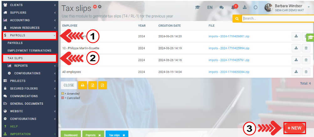 To issue tax slips for your employees, click in the left menu: Payroll > Tax Slips > +New.