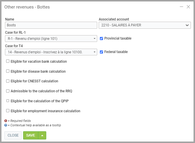 Decide if the employee pays tax on this income. For example, mileage is generally non-taxable. It is also possible to configure a box for T4 and RL-1 slips for each type of income. If these boxes are left empty, the income will be considered regular income when generating these reports.