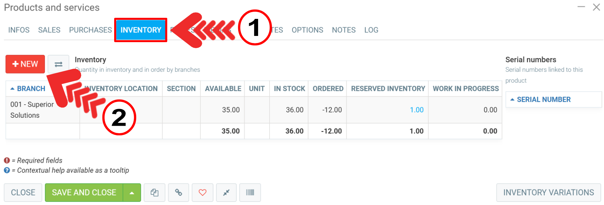 On the Inventory tab, click on the red button +New. You can add products to inventory in the same way as with option 1.