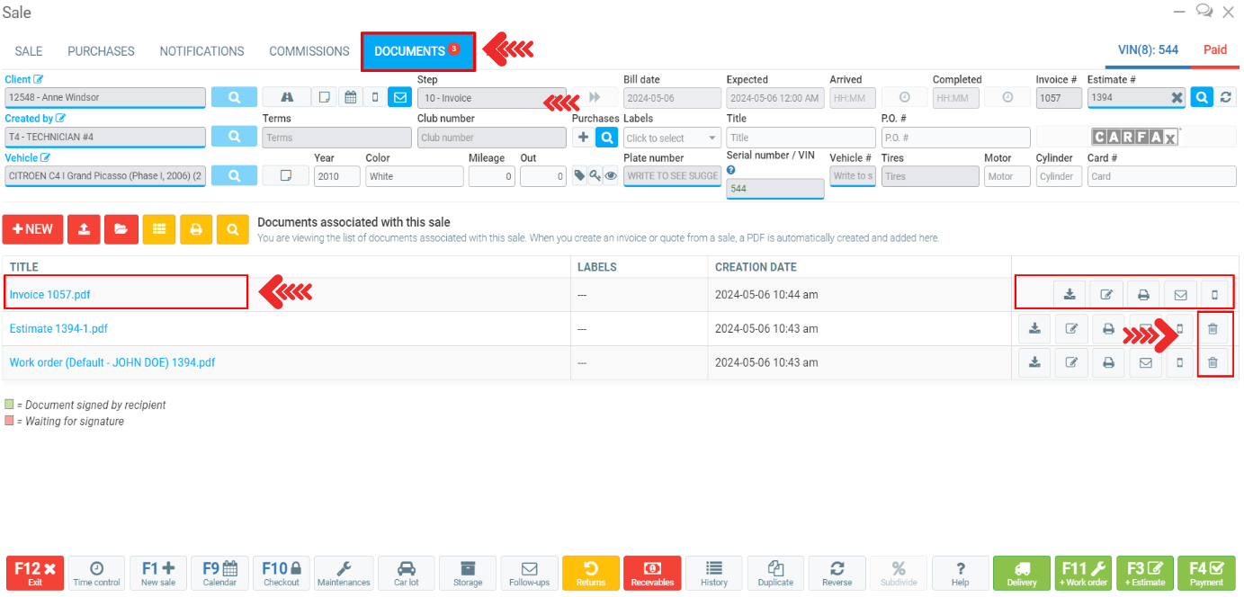 However, the only document that does not display the trash icon is the invoice.