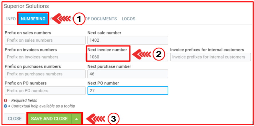 In the Numbering tab, edit the Next invoice number.