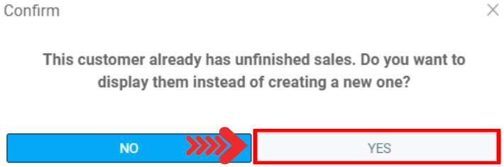 A pop-up window will ask: "This customer already has unfinished sales. Do you want to display them instead of creating a new one?" Answer Yes.