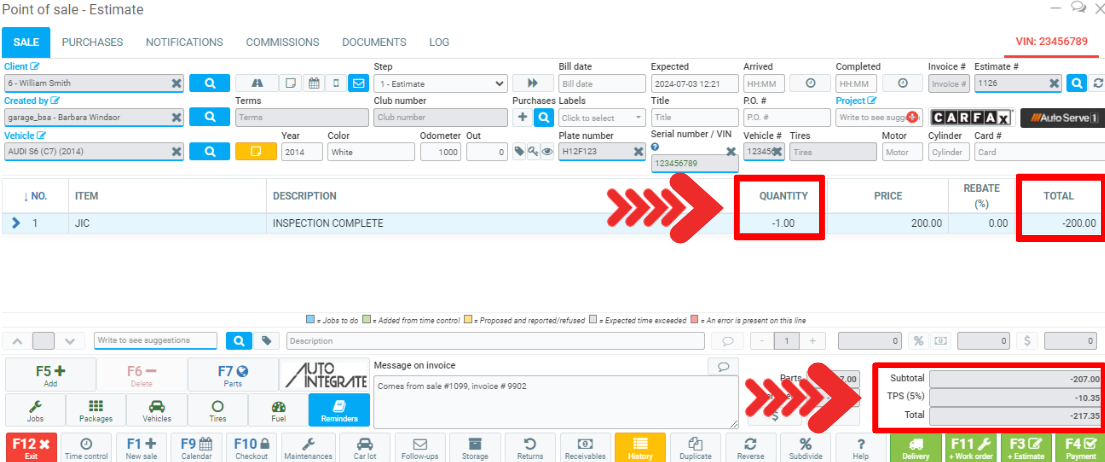 GEM-CAR will immediately duplicate the original sale, but with negative quantities.