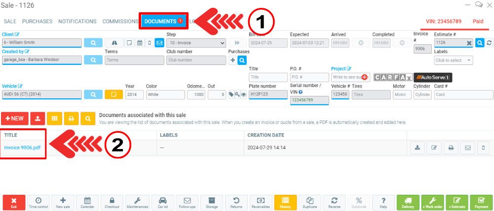 Then, after requesting and obtaining your confirmation, GEM-CAR will create for you invoice number 9906, which is the reversal of your original invoice number 9902. It will be filed in the Documents tab of the file.