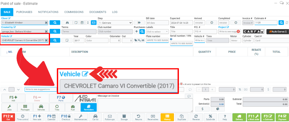 Note: When modifying information about a vehicle, remember that you are not only modifying it in the current sale, but rather modifying the vehicle's file. Therefore, if you start a new sale with that same vehicle, the new information will show.