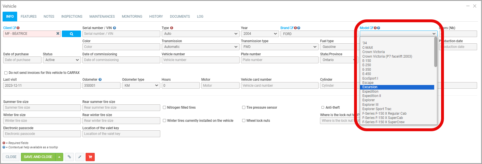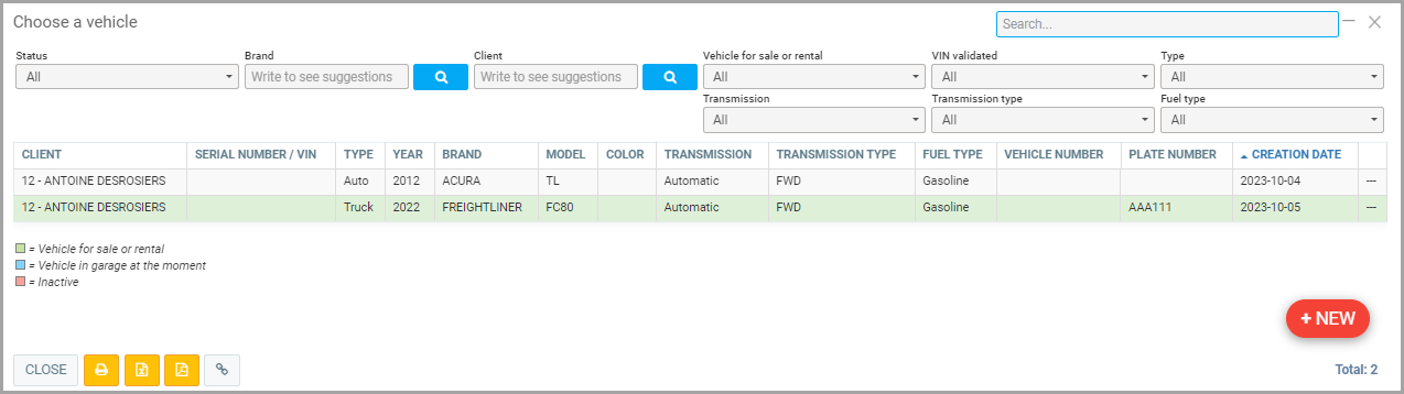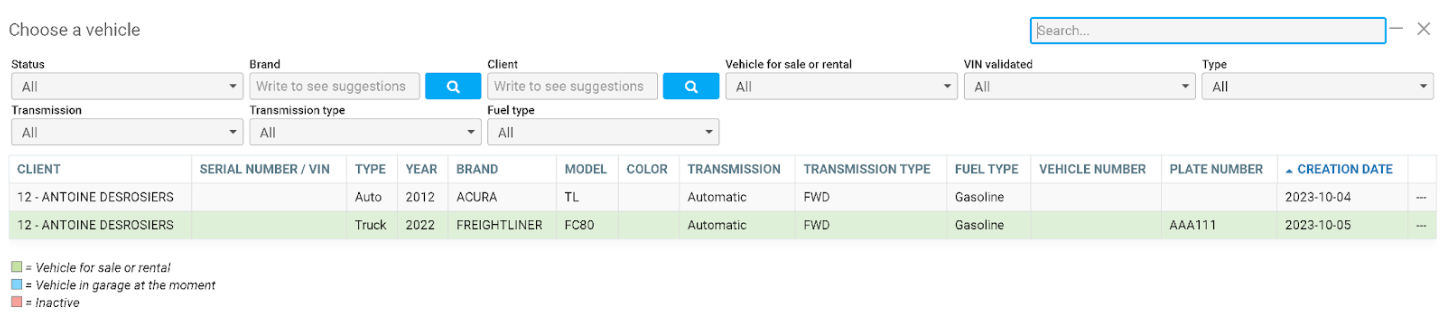Selecting the Client, you will automatically be offered to choose a vehicle from the client's file.