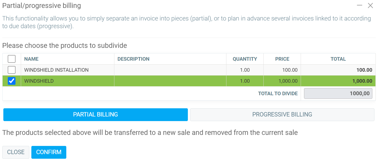 First, we are going to Subdivide a sale, so that we can create an invoice for only part of it.