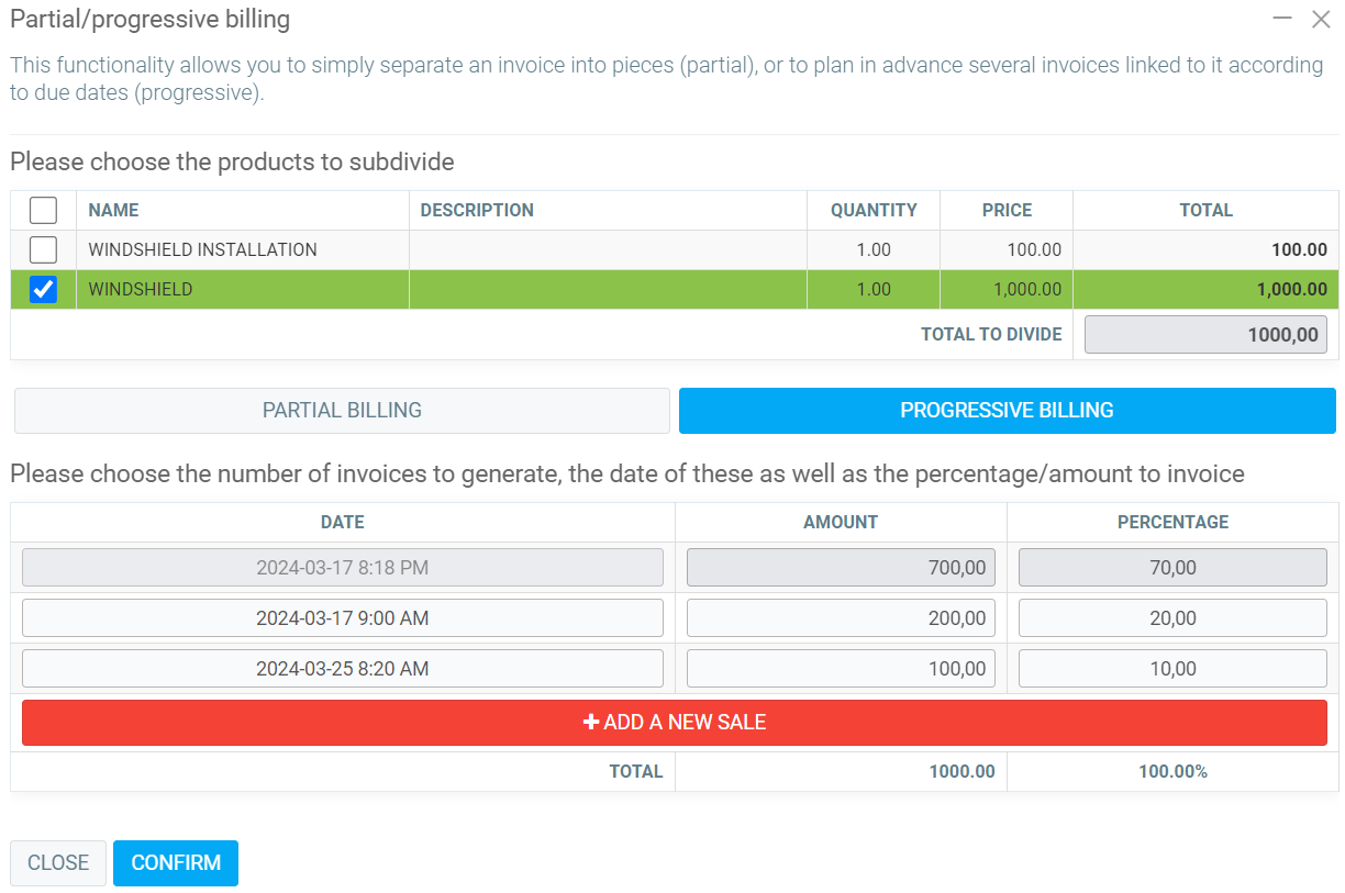 You can also use the Progressive billing button to select the number of invoices to be generated.
