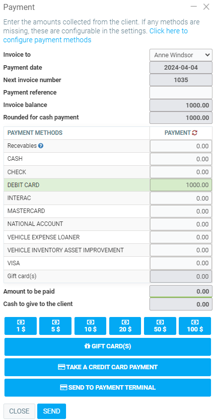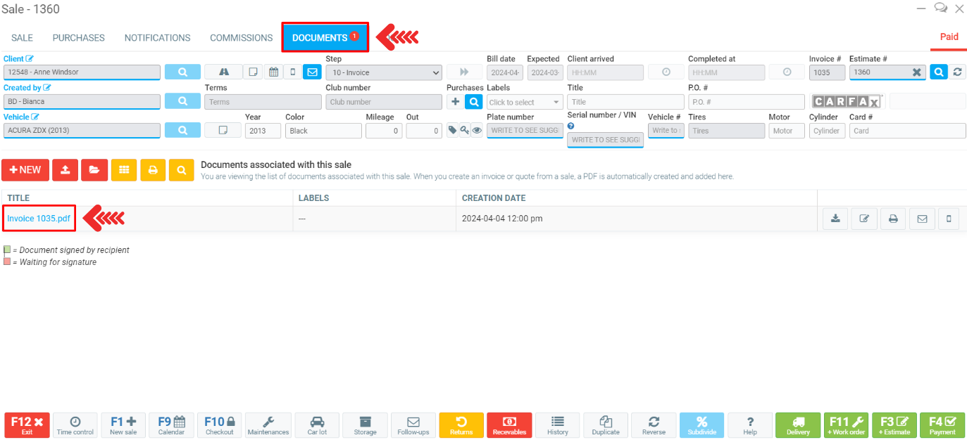 Note: When you hover over the button, which appears at the bottom right of the screen, you'll notice that GEM-CAR is already indicating that you can identify the items that won't be invoiced immediately and that will have to be transferred to a new sale.