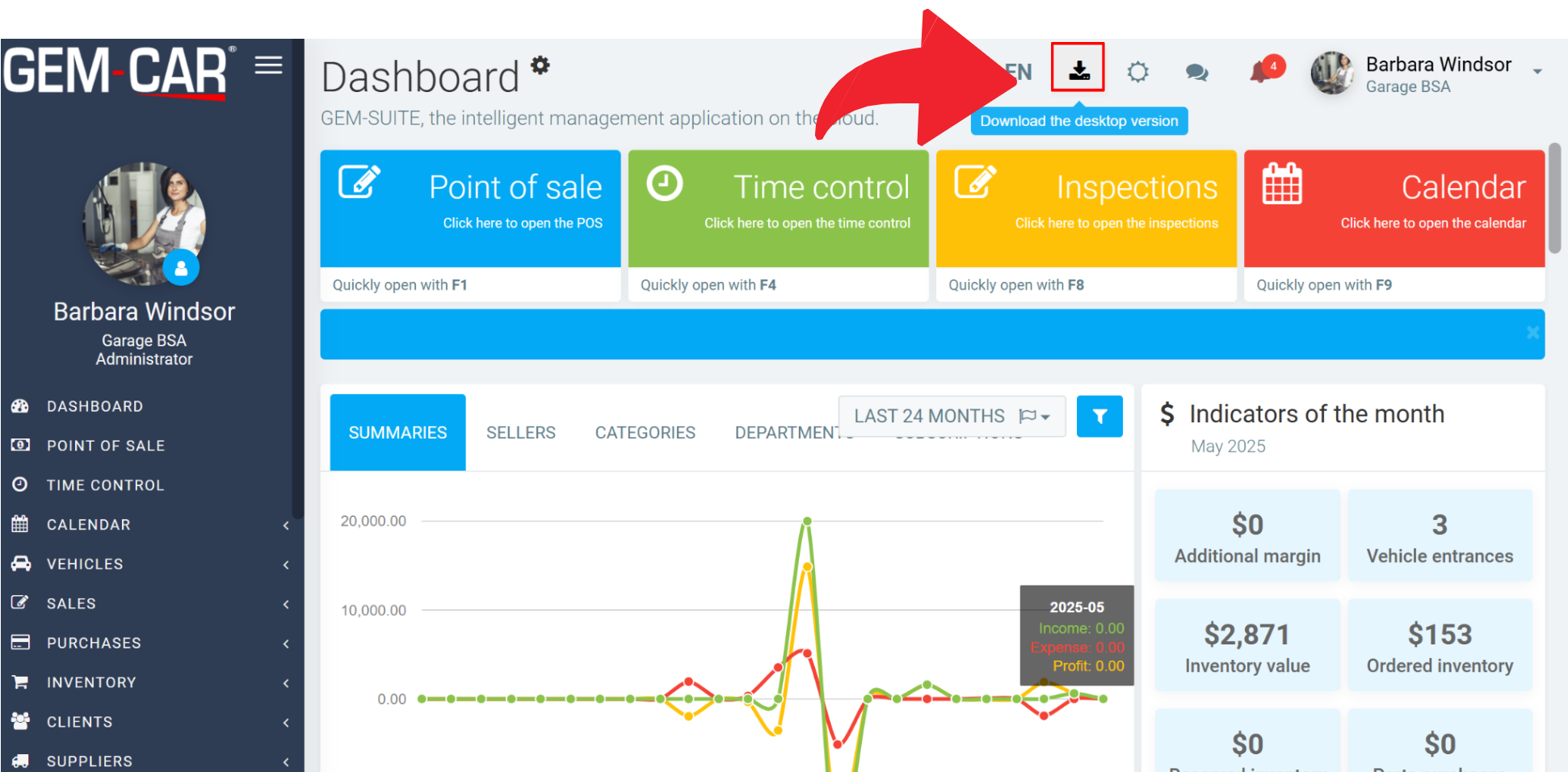 To download the Desktop Application, click on the arrow pointing down which is located on the top menu on the left of your avatar. Then install GEM-CAR with GEM-CAR.exe file.