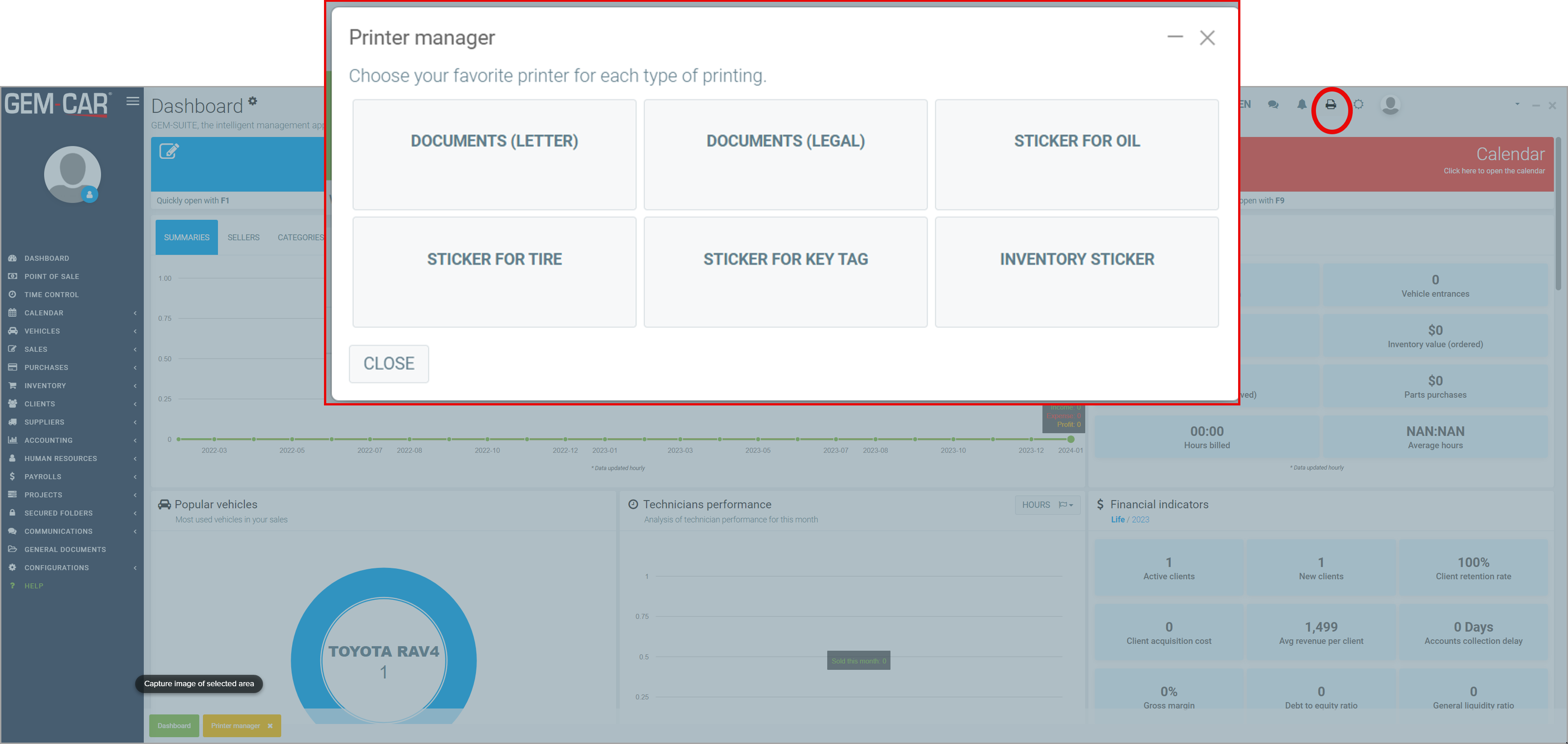 In order to configure the Default printers on GEM-CAR, make sure you are working on the Desktop Application.