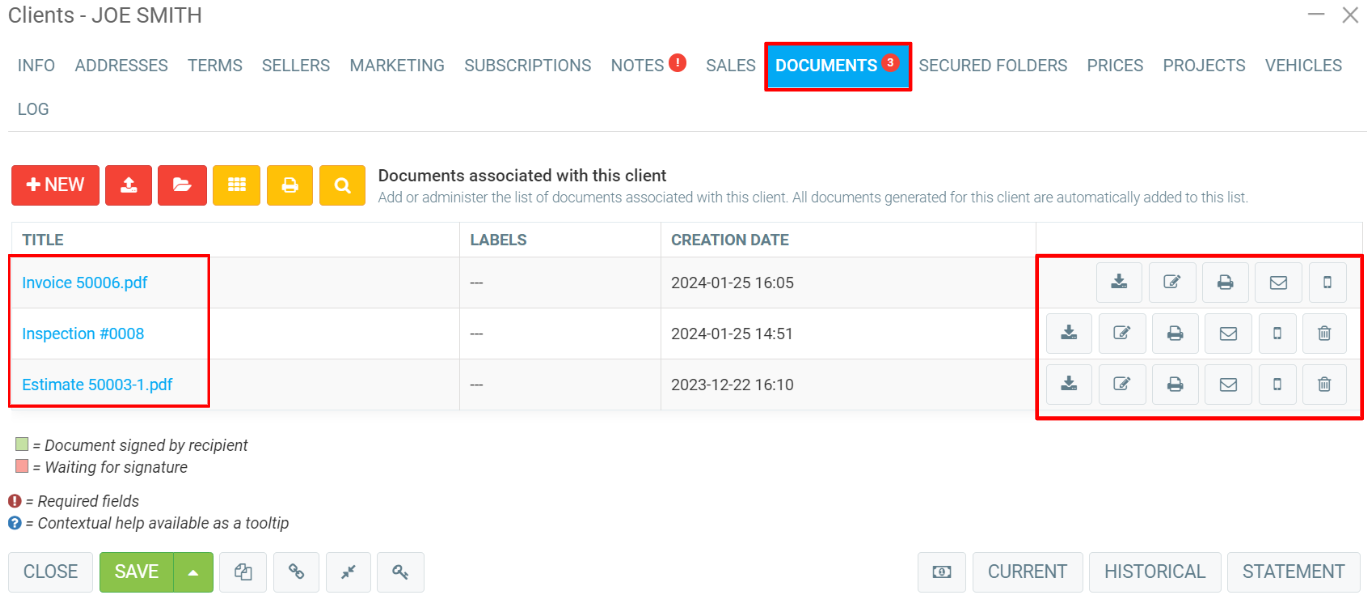 3) Under the Documents tab, click on the icon associated with the action you want to take according to the legend below: