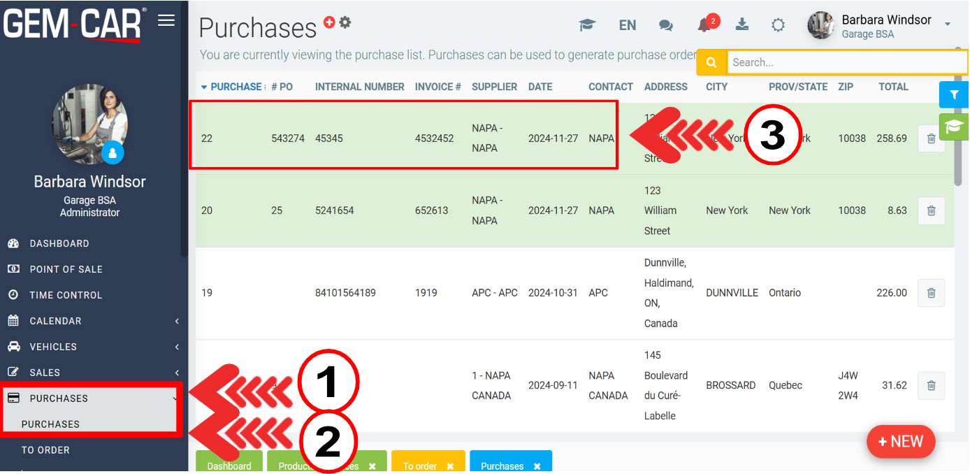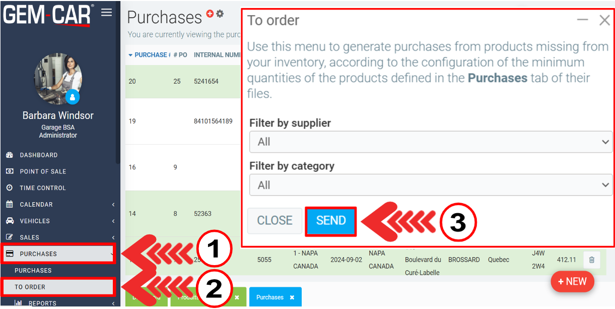 To configure parts to be ordered automatically when the quantity is below the minimum required, click Purchases > To order.
