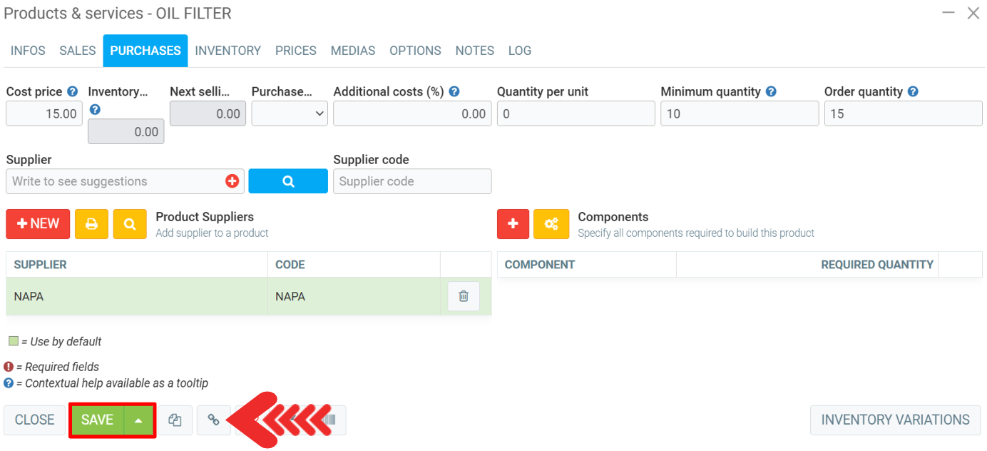 In the Purchases tab, enter the Minimum Quantity and Order Quantity.