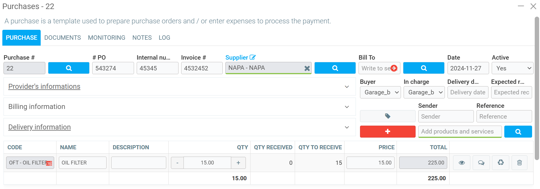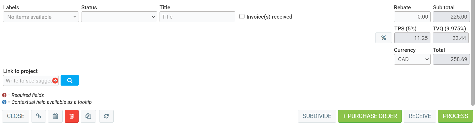 When you open the purchase, you have access to the details and can Subdivide, generate Purchase Order, Receive or Process the purchase.