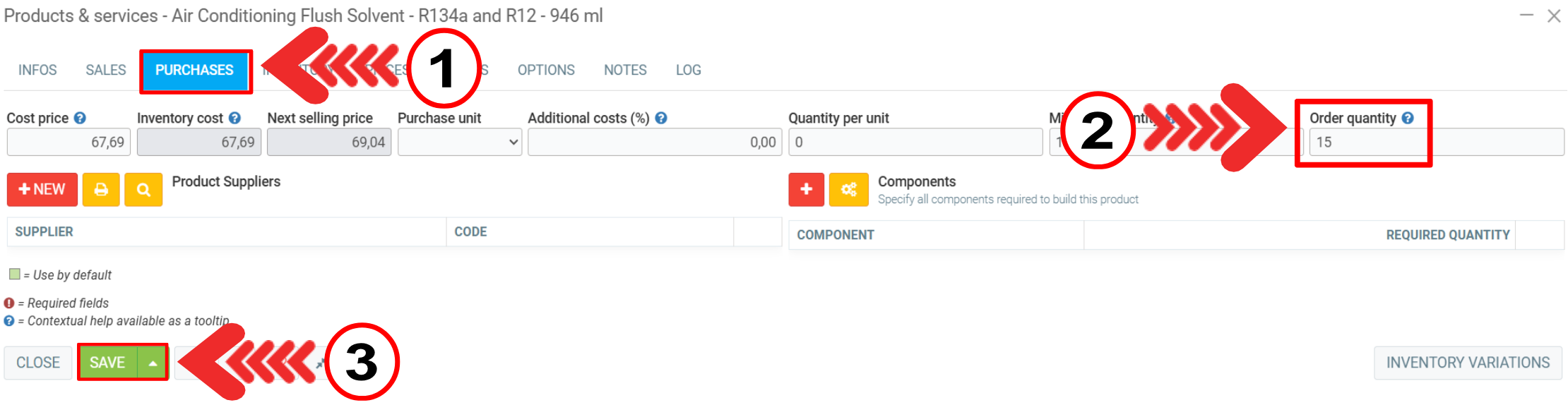 Then click on the Purchases tab and enter the desired number in the Order quantity field.