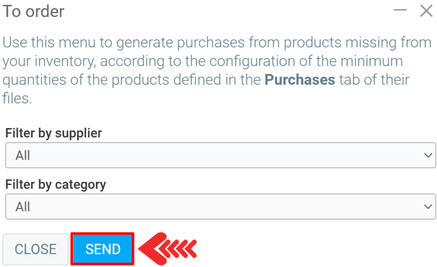 When you select the tab Purchases > To order, a new window will open for you to confirm the supplier and category.