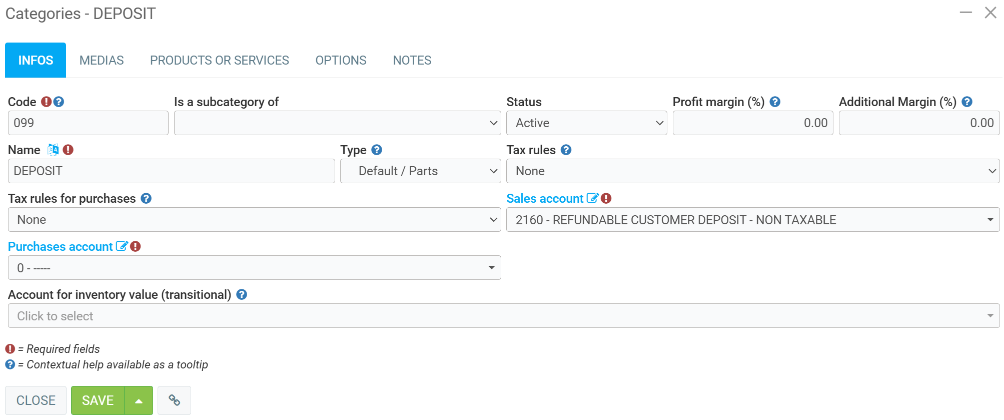 To create a deposit as a type of category, click on Inventory > Categories > +New.