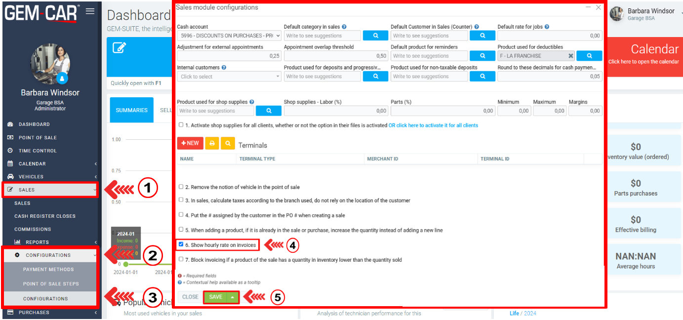 To display the shop hourly rate on invoices in GEM-CAR, follow these steps: