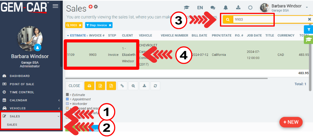 If you don't see the number of your invoice to be reversed on the screen, and you don't want to have to scroll down pages and pages to find the sale from which this invoice to be reversed was created, the alternative method is to search by the number of the invoice to be reversed.