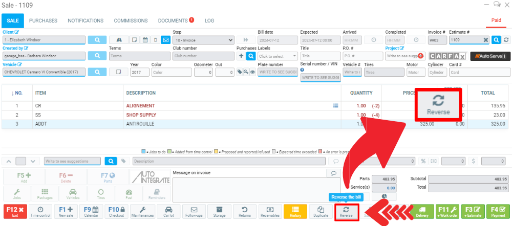 When you click on the button, GEM-CAR will ask you to confirm the action: ''Are you sure you want to reverse this sale?''.
