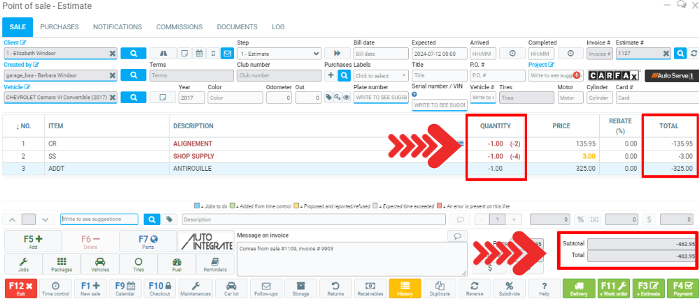 GEM-CAR will immediately duplicate the original sale, but with negative quantities.