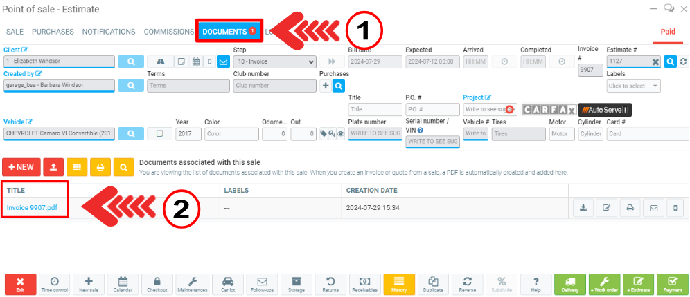 Then, after requesting and obtaining your confirmation, GEM-CAR will create for you the invoice number 9907, which is the reversal of your original invoice number 9903. It will be filed in the Documents tab of the file.
