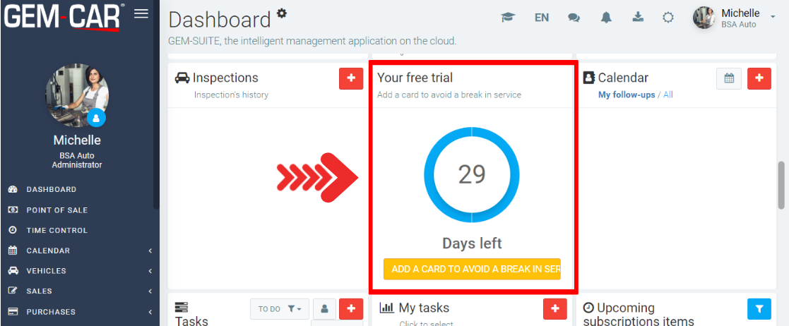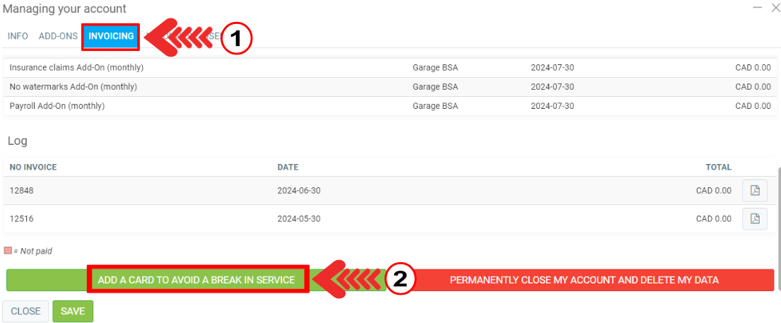 Under the tab Invoicing, enter your credit card information in the green button "Add a card to avoid a break in the service".