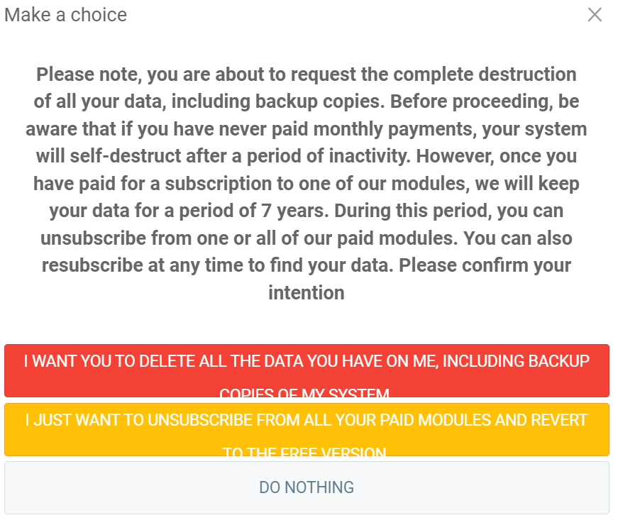 - I just want to unsubscribe from all your paid modules and revert to the free version.