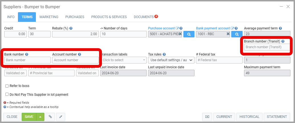 Complete the Transit Number, Bank (Institution) Number, and Account Number from your supplier's check specimen.
